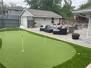 People favor lush green grass in landscape design. However, most individuals do not have the time or motivation to commit to the laborious effort of maintaining these spaces. Our advice is to use artificial grass in this area. This synthetic turf is an excellent alternative for low-maintenance commercial and residential landscaping. The ease of installing and maintaining artificial grass makes it an appealing option for landscaping and putting greens. Routine care requires little time or effort, including mowing, watering, and fertilizing. Synthetic turf requires occasional hosing and blowing to remove dead leaves or debris. It is resistant to the elements and will not disintegrate with prolonged exposure to the sun. Many homeowners choose synthetic turf due to these benefits. These photographs demonstrate the competence with which we design, install, and manage small and big artificial turf lawns. Artificial grass is also an excellent option for private putting greens, and we help with these installations too.